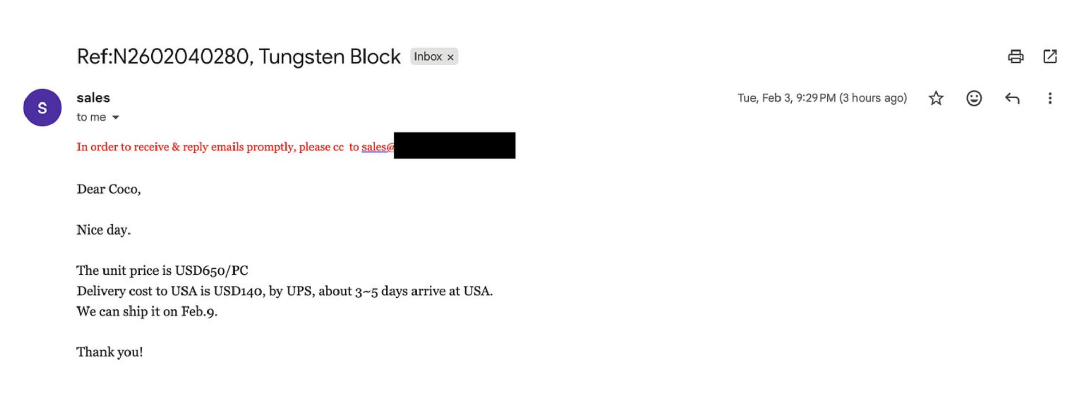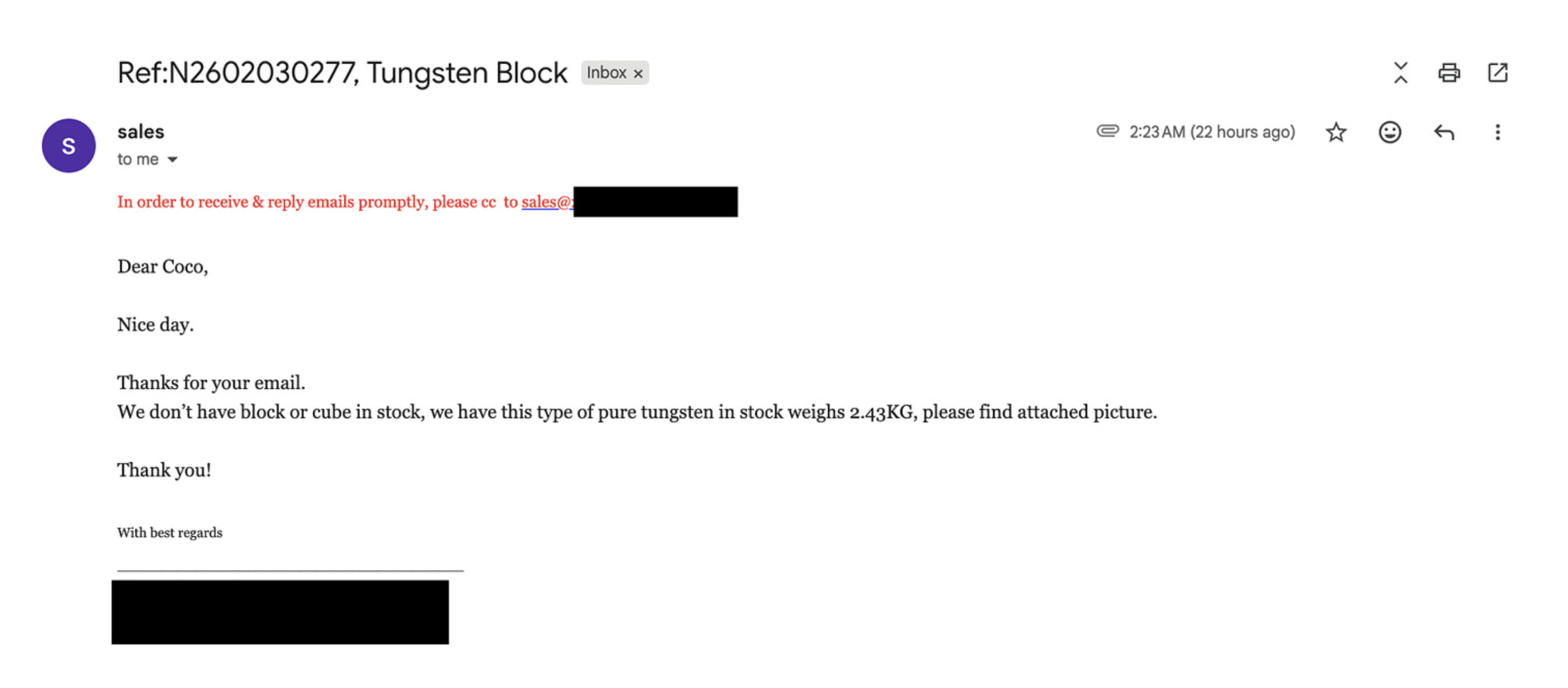 Yesterday, we did a test asking Coco to source tungsten cubes inspired by Anthropic's Project Vend. We had Coco source vendors, and automatically draft an email to reach out and get a quote. To our pleasant surprise, a vendor from China responded promptly. He was even nice enough to include an image of the tungsten he had available: